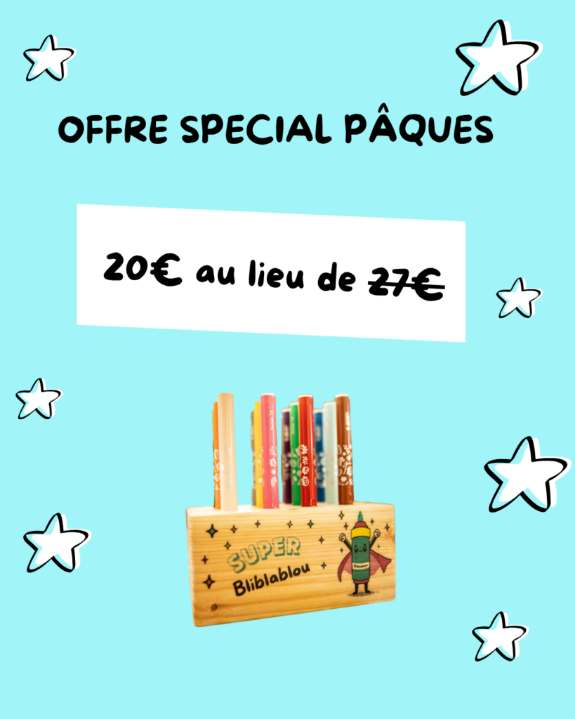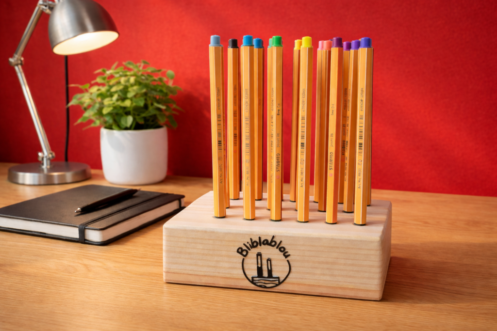 Avec son socle en bois astucieux, Bliblablou facilite le dessin en gardant les feutres bien rangés et accessibles en un geste. Pratique, ludique et durable, il accompagne les petites mains dans leur créativité au quotidien.
